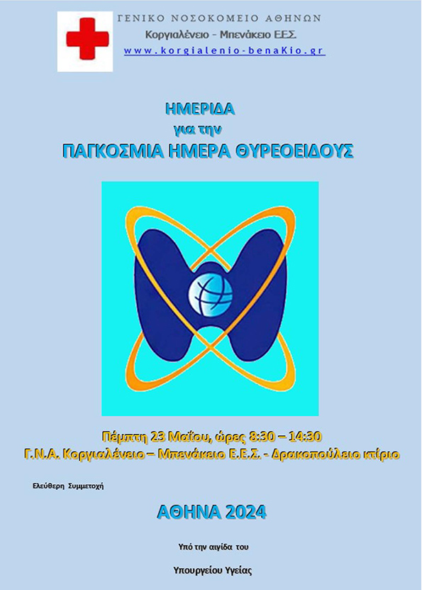 Στο Νοσοκομείο Γ.Ν.Α. Κοργιαλένειο Μπενάκειο Ε.Ε.Σ., στα πλαίσια της Παγκόσμιας Ημέρας Θυρεοειδούς, διοργανώνεται στις 23 Μαΐου 2024 σχετική Ημερίδα, με ελεύθερη συμμετοχή.